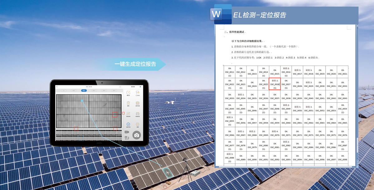 便攜式EL檢測(cè)儀 其通過(guò)IPAD或pc掃條碼操作進(jìn)行遠(yuǎn)程操作,搭配萊科斯專利性全自動(dòng)對(duì)焦(免對(duì)焦)功能,可對(duì)組件進(jìn)行快速檢測(cè),檢測(cè)周期0.04~10秒檢測(cè)時(shí)間,可實(shí)現(xiàn)雙組件自供電上電檢測(cè),24小時(shí)續(xù)航,操作簡(jiǎn)單,攜帶方便,可檢測(cè)組件內(nèi)部隱裂缺陷,衰減熱斑等質(zhì)量問(wèn)題時(shí)間,高配可實(shí)現(xiàn)1~25塊組件的同步上電檢測(cè),操作簡(jiǎn)單攜帶方便。