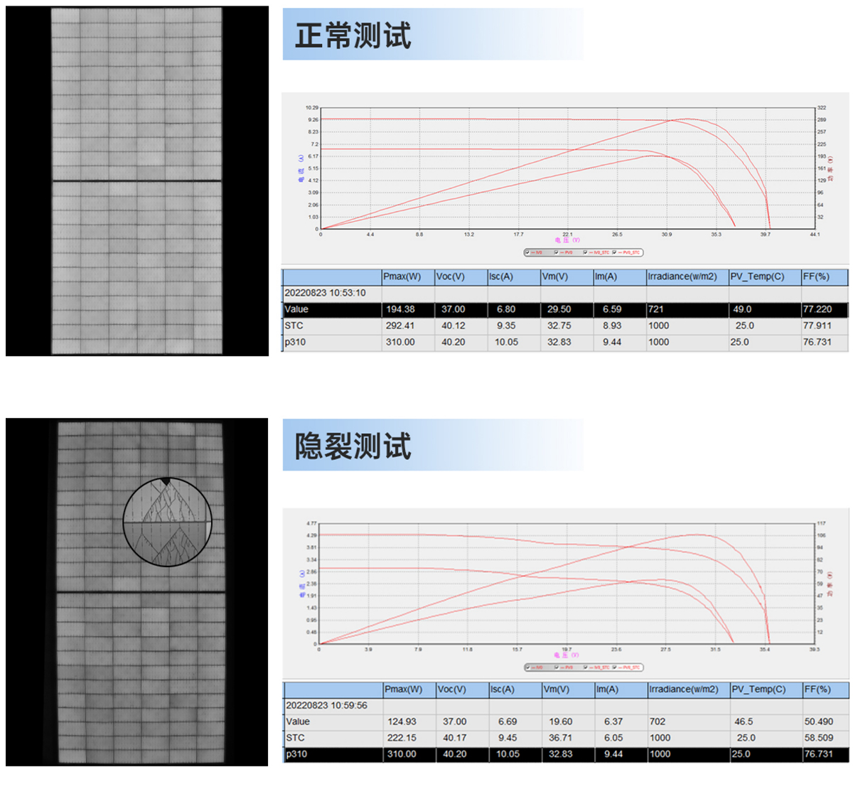 - 光伏電池板破?貫穿整個電池?,但通過伏安特性測試,在如圖分析軟件中看到,開路電壓和短路電流損失分別為10.9%和53.7%,但測試曲線出現(xiàn)出現(xiàn)明顯改變,功率損失分別達(dá)到67.8%和STC-63.5%。便攜式IV測試儀可更好的輔助EL檢測從?判定組件是否可繼續(xù)使?。