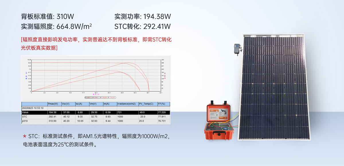 - STC標(biāo)稱參數(shù)轉(zhuǎn)化測試:IV測試,匹配當(dāng)前95%以上光伏電池板規(guī)格,更快速的切換不同規(guī)格組件參數(shù),并?動計算出電池板當(dāng)前發(fā),電效率以及轉(zhuǎn)化率,幫助?戶更精準(zhǔn)的知悉組件真實參數(shù)。