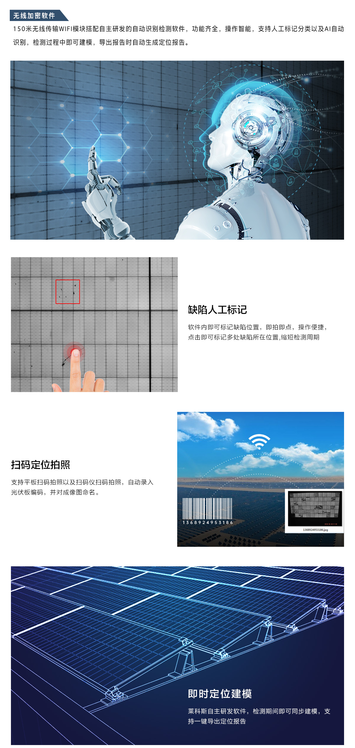 萊科斯(LAILX)致力于光伏檢測(cè)設(shè)備的研發(fā)與生產(chǎn),現(xiàn)有設(shè)備包括 EL檢測(cè)系列,便攜式EL檢測(cè)儀,組串式EL檢測(cè)儀,無(wú)人機(jī)EL測(cè)試儀,IV功率測(cè)試系列,便攜式IV測(cè)試儀,電能質(zhì)量分析儀,等相關(guān)光伏電站檢測(cè)設(shè)備與光伏產(chǎn)線實(shí)驗(yàn)室檢測(cè)設(shè)備。