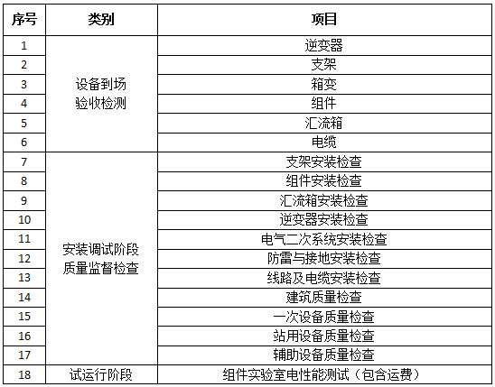 根據(jù)光伏電站建設(shè)階段需求需要制定科學(xué)合理的階段性監(jiān)督檢測(cè)工作計(jì)劃,包括:設(shè)備到場(chǎng)驗(yàn)收檢測(cè)、安裝調(diào)試階段質(zhì)量監(jiān)督檢查、試運(yùn)行階段設(shè)備性能測(cè)試、智能檢測(cè)軟件測(cè)試等,以確保各階段建設(shè)無(wú)問(wèn)題、無(wú)隱患。
