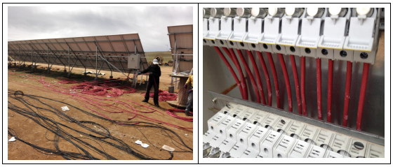 由于接線方法不合理,安裝工人在沙土地上拖拽線纜,造成匯流箱內(nèi)組串線普遍劃傷: