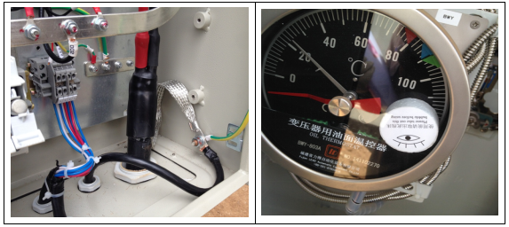 匯流箱接地線未連接到接地排上、箱變底部電纜溝未封堵、箱變事故放油未按引流管、無(wú)事故放油池、逆變器電壓表?yè)p壞、變壓器用油面溫控器內(nèi)泡沫未取出(如下圖所示):